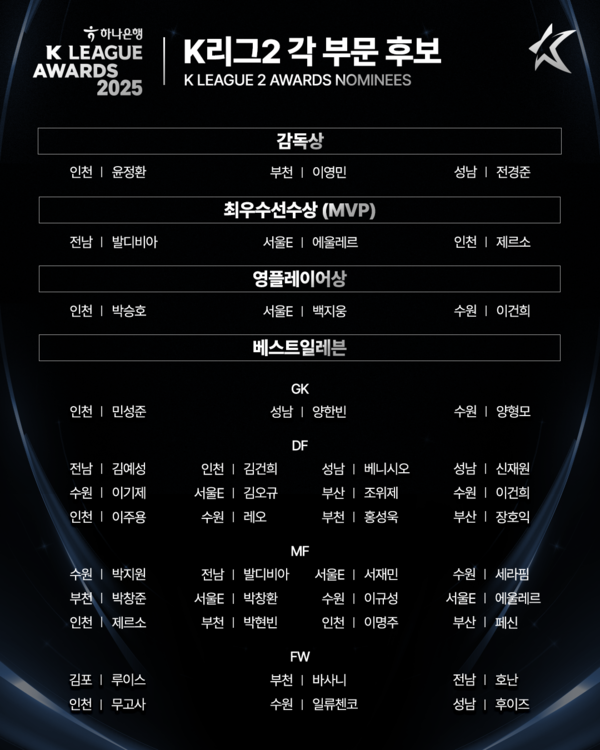 [풋볼리스트] 김정용 기자= '하나은행 K리그 2025 대상' 시상식의 주요 후보가 발표됐다. 전체에서 가장 큰 상이라고 할 수 있는 K리그1 MVP 부문은 전북 박진섭, 수원FC 싸박, 울산 이동경의 3파전 구