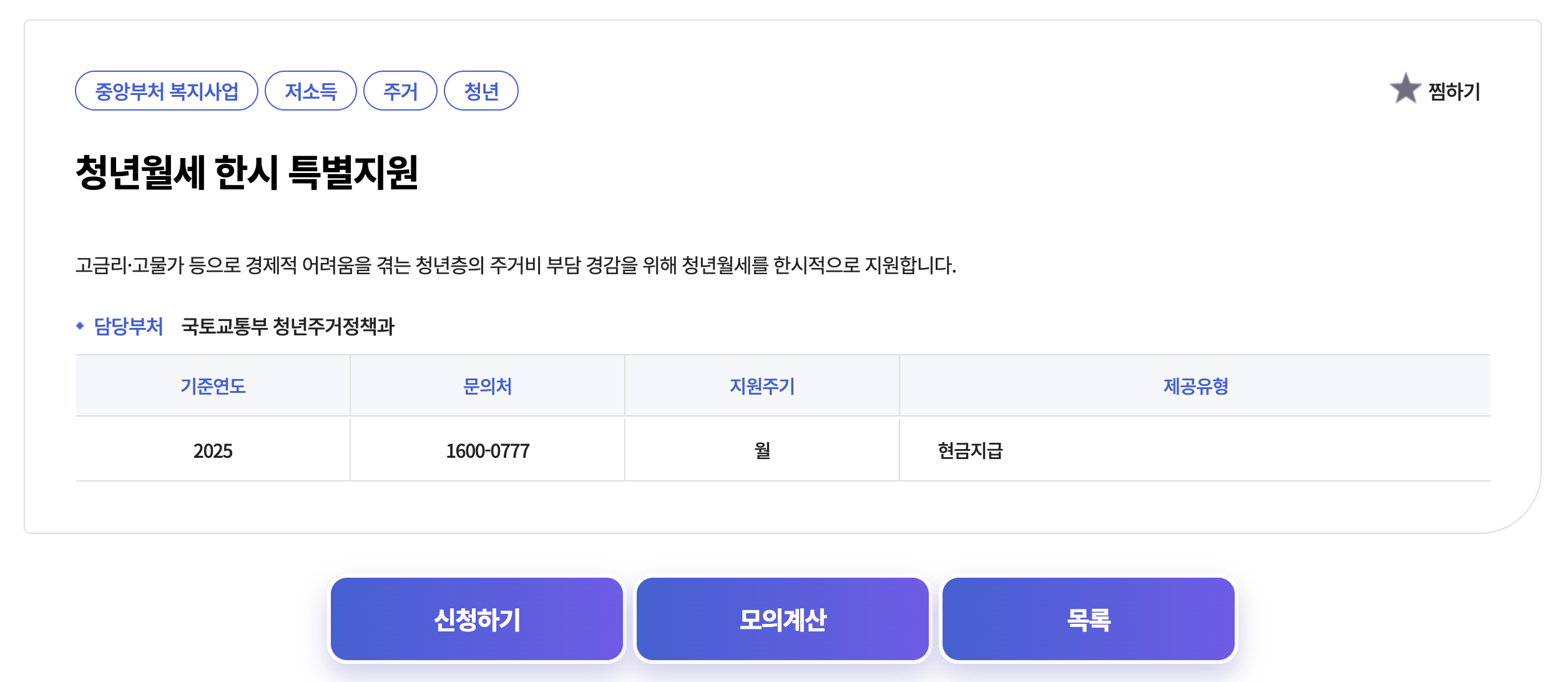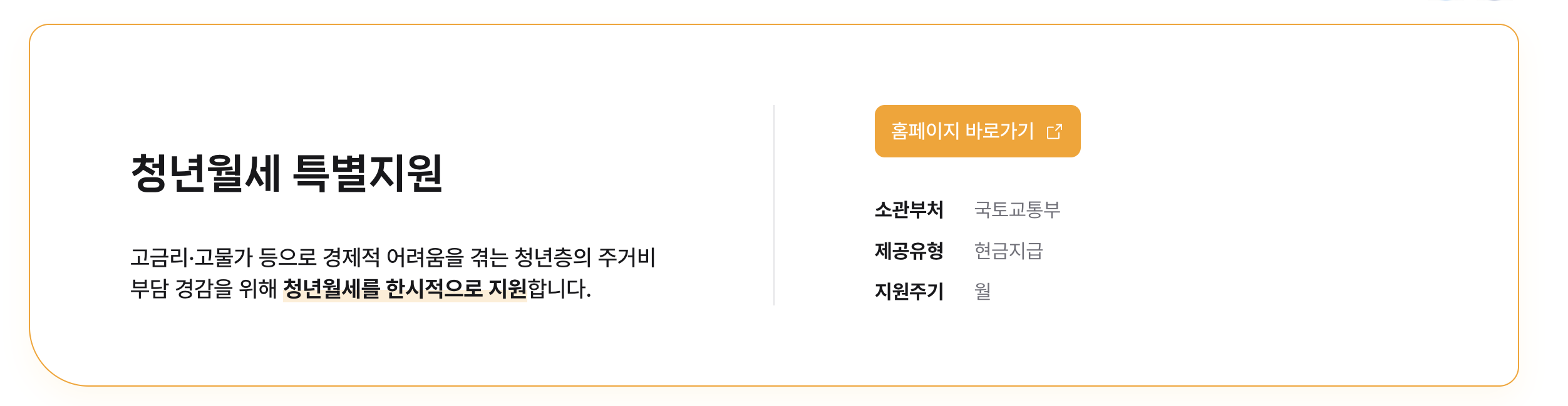 - 월세 지원액: 매월 월세의 일부(예: 월세 50만 원 → 최대 10~20만 원 지원 — 실제 공고 참고)