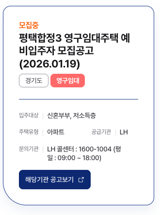 정리하면 평택합정3 영구임대주택(2026년) 은 “조건을 충족한 뒤 정해진 기간에 거주지 행정복지센터에서 현장접수 → 예비순번 대기” 구조입니다.